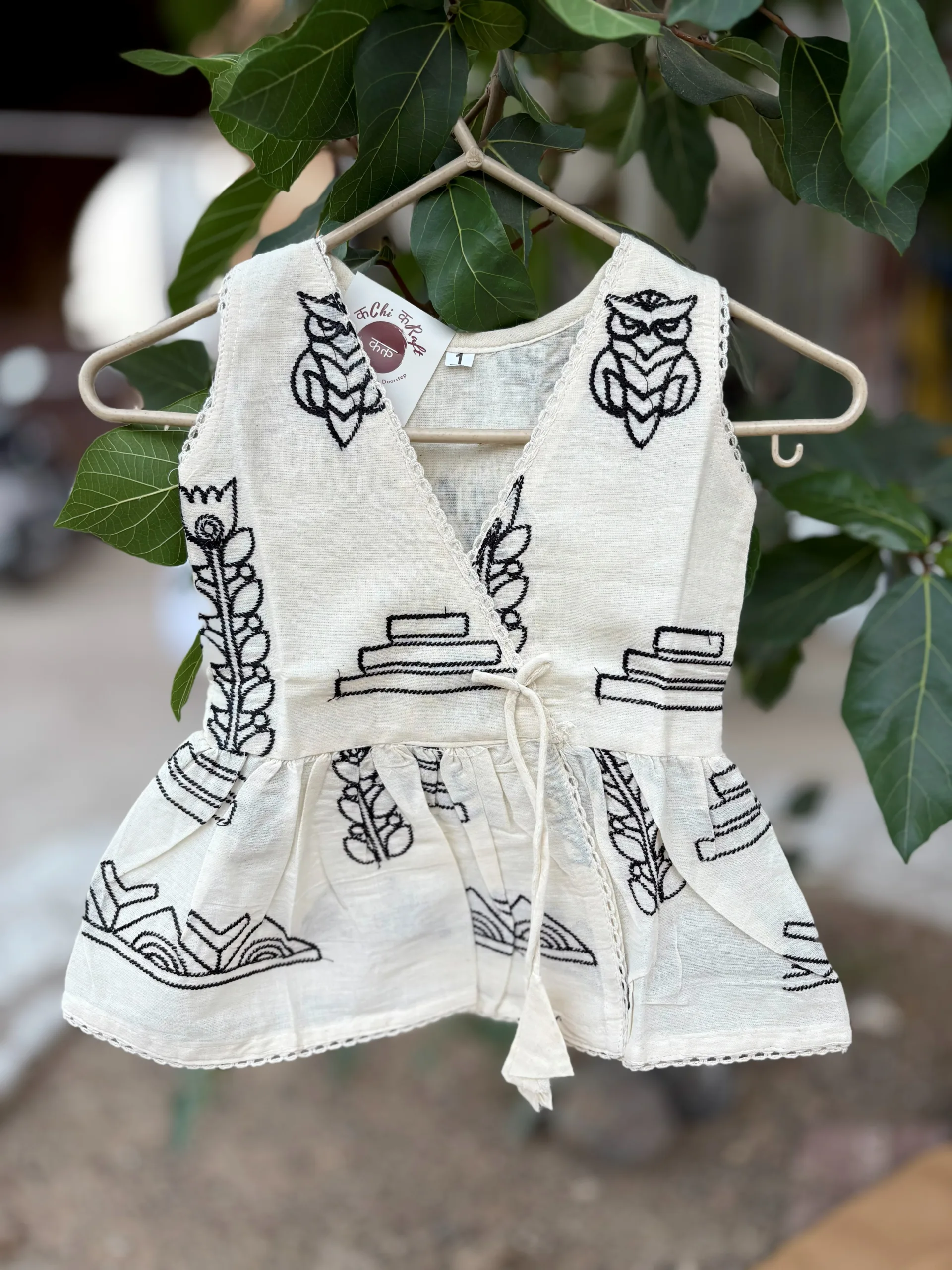 A soft and breathable Khadi cotton sleeveless wrap top for little girls, featuring adorable pastel butterfly embroidery, lace detailing, and a side tie-up for easy comfort. Perfect for summer days and eco-conscious fashion.